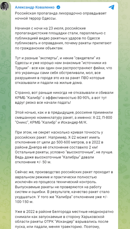 "При этом не секрет, насколько кривая точность у российских ракет. Например, Х-22 может иметь отклонение от цели до 500-600 метров, а в 2022 году в районе Днепра ее отклонение составило 2 км! Другие ракеты, условно "высокоточные", не лучше. Ведь даже высокоточные "калибры" давали отклонение +/- 50 м", — подчеркнул Коваленко.