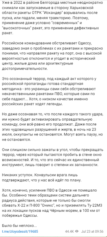Российские пропагандисты оправдывают ночную ракетную атаку россиян в Одессу. Они, когда начали появляться видео последствий ударов по городу, начали оправдываться, почему ракеты разрушают гражданскую инфраструктуру.