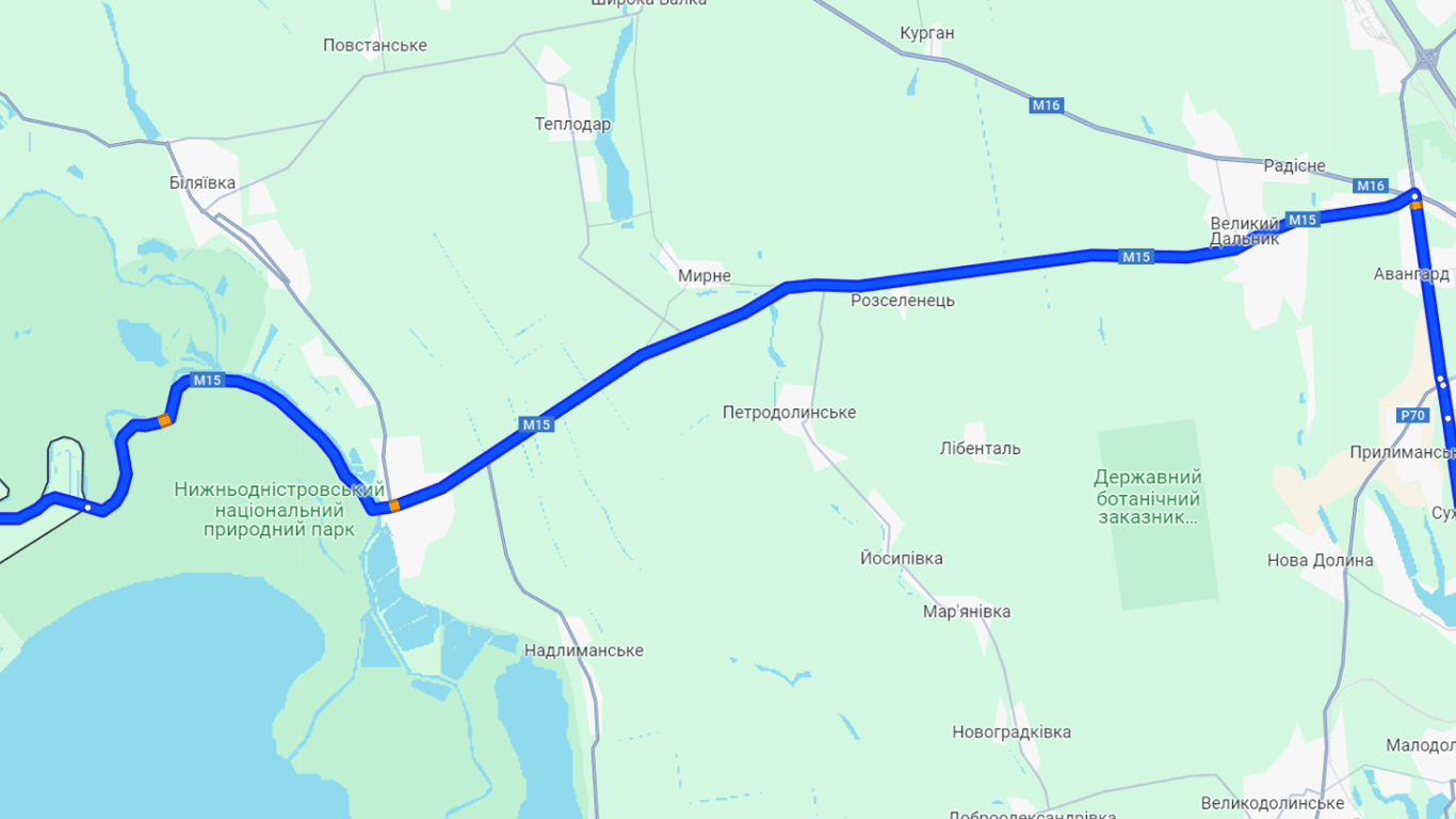Сейчас в сторону пункта пропуска "Паланка — Маяки — Удобное" есть пробка в районе Маяк и КПП. Эти участки на картах обозначены оранжевым цветом. Путешествие в Паланку продлится сегодня более часа. На самом автомобильном пункте пропуска очередей тоже не наблюдается.