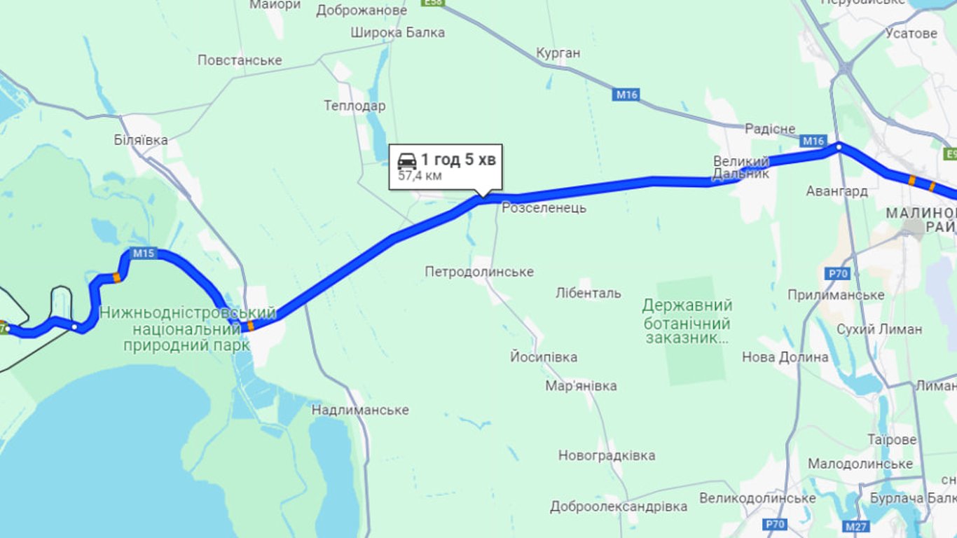 В направлении пункта пропуска "Паланка — Маяки — Удобное" зафиксированы пробки в пределах Маяков и в природном парке. Наблюдаются осложнения у молдавского КПП, что отмечено красным цветом на картах. Проезд в Паланку сегодня продлится 1 час 5 минут.