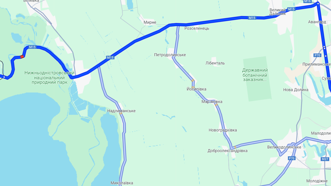 Сейчас в сторону пункта пропуска "Паланка — Маяки — Удобное" есть пробка в районе КПП. Этот участок на картах обозначен красным цветом. Путешествие в Паланку продлится сегодня более часа. На самом автомобильном пункте пропуска очередей тоже не наблюдается.