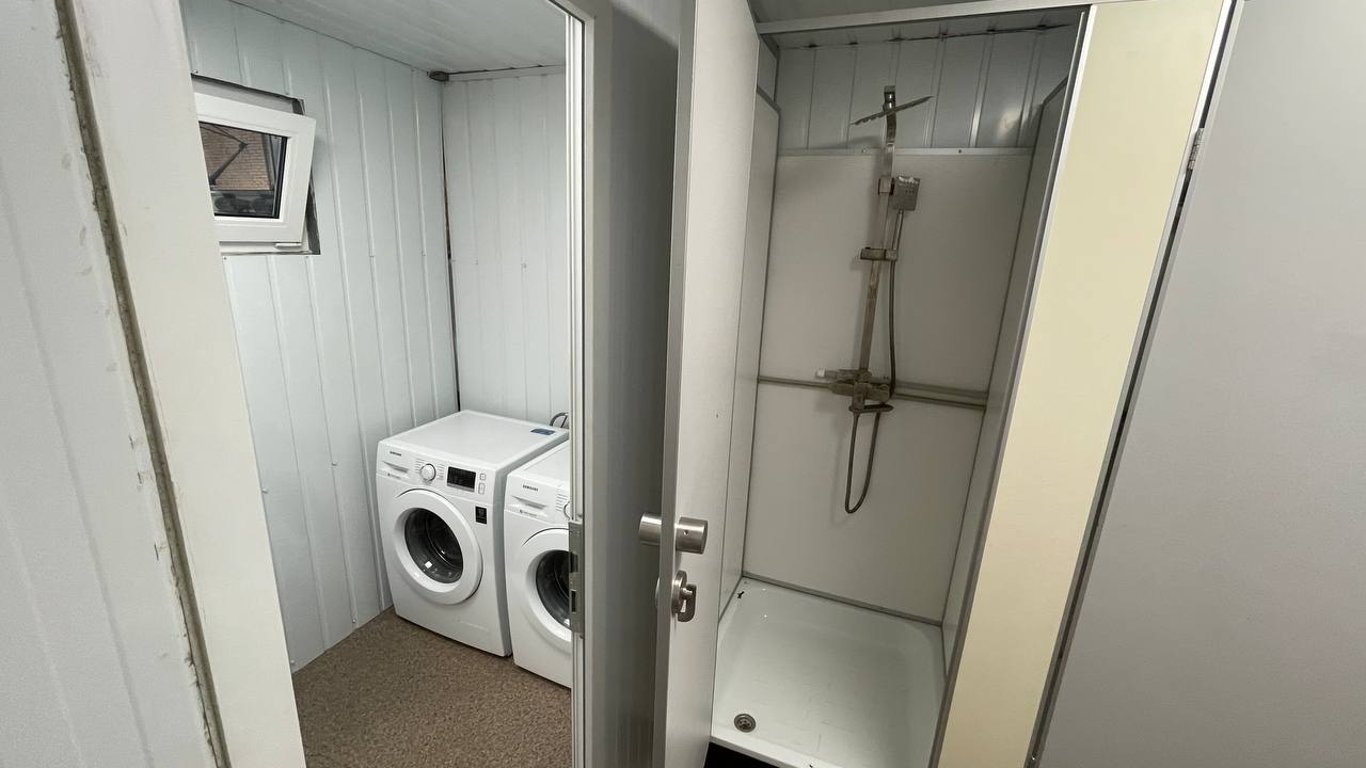 “Получили обычные контейнеры для перевозки грузов и через три недели оборудовали их всем необходимым. Здесь три помещения, в первом две стиральные машины, во втором три душевых кабинки и умывальник, а также хозяйственный блок” , – рассказывает Иван Цюро.
