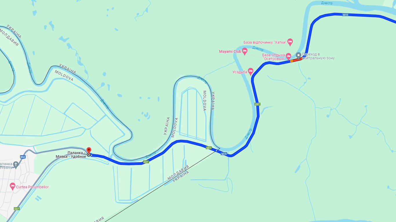 На трассе Одесса — Рени, как обычно, несколько усложнено движение перед КПП, расположенное за селом Маяки. На Google Maps этот участок постепенно краснеет. В настоящее время наблюдается менее километра пробки. Дорога в Паланку займет более часа.