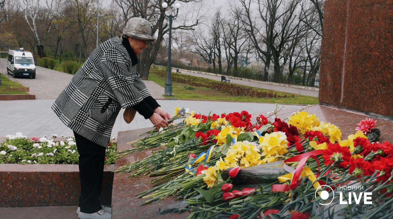 Одесситы приносят цветы и чтят погибших героев-освободителей.