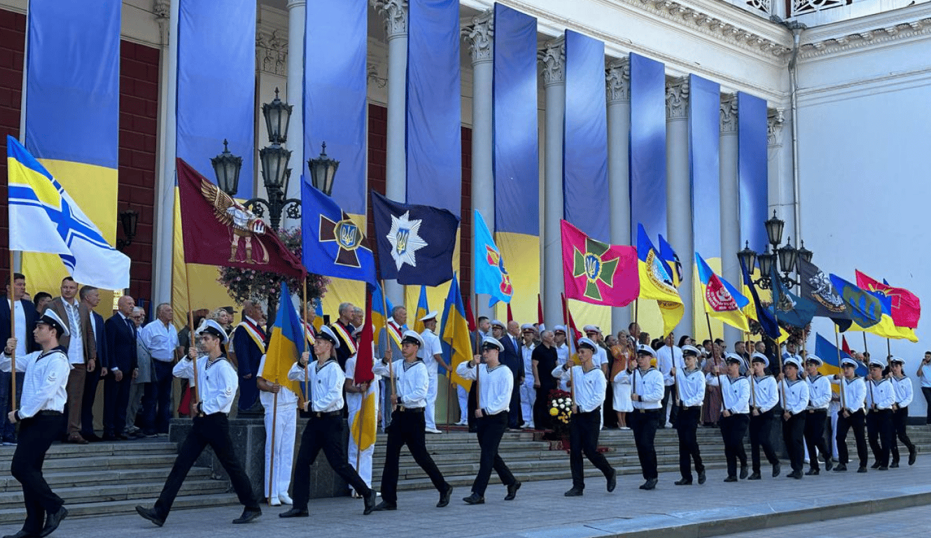 Несмотря на то, что в стране действует военное положение, традиция поднимать государственный флаг Украины в День города в Одессе осталась. Из-за многолюдного митинга, прошедшего утром под стенами мэрии, торжественные мероприятия пришлось сместить во времени. Несмотря на это, сине-желтый флаг, а также флаги всех войск, которые сегодня защищают нашу страну от агрессора, и госфлаги стран, поддерживающих Украину в борьбе, развевались у городского совета.