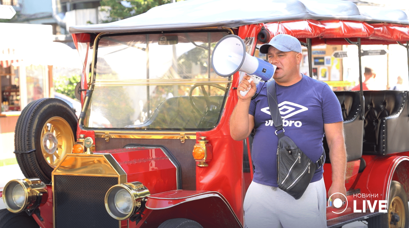 С самого утра на центральной улице города жизнь бурлит. Теплая погода позволяет одесситам и гостям Одессы посетить пешие экскурсии или прокатиться на одном из экскурсионных автомобилей, где работает одессит Николай. Мужчина рассказывает, что вместе с коллегой показывают Одессу всему миру.