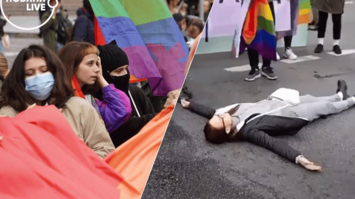 Одесситка в Киеве легла перед колонной ЛГБТ-прайда и начала давать интервью. Видео