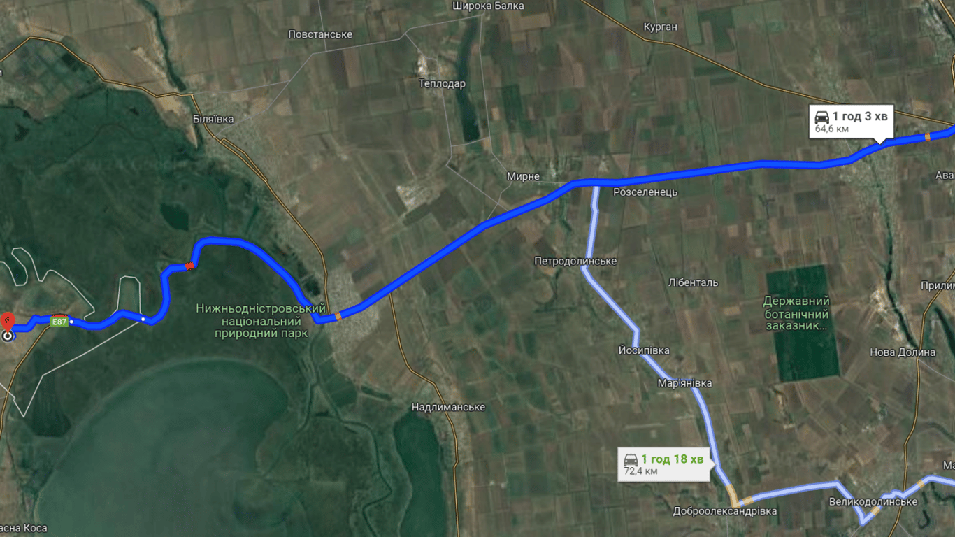 Сейчас в сторону Паланки есть пробка на выезде из Одессы, в районе Маяков и КПП, которая находится в пределах Нижнеднестровского национального природного парка, а также перед самым пунктом пропуска. Эти участки на картах обозначены оранжевым цветом.