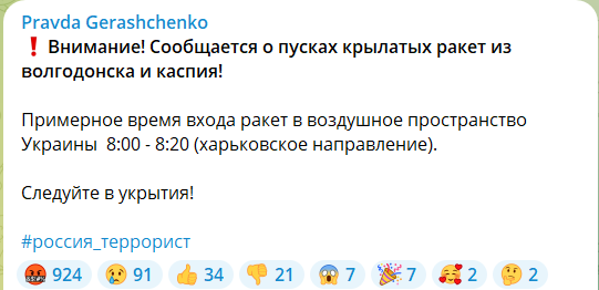 "Внимание! Сообщается о пусках крылатых ракет с волгодонской и каспии! Приблизительное время входа ракет в воздушное пространство Украины 8:00 – 8:20 (харьковское направление)", — говорится в сообщении.