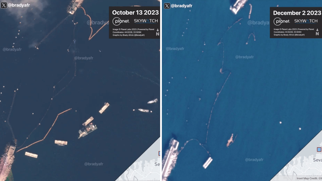 Добавим, что боновые заграждения, которые враг разместил для защиты Крымского моста, были уничтожены мощным штормом, бушевавшим 26-27 ноября. Три баржи, на которых крепились заграждения, были полностью затоплены, еще одна — частично, две — смыло волнами, и еще одна осталась на плаву, но не была закреплена. Эти заграждения разместили еще в конце августа этого года после того, как морские дроны-камикадзе 17 июля совершили очередную успешную атаку. По замыслу именно они должны были создать сплошной барьер. Но он не выдержал испытание погодой.
