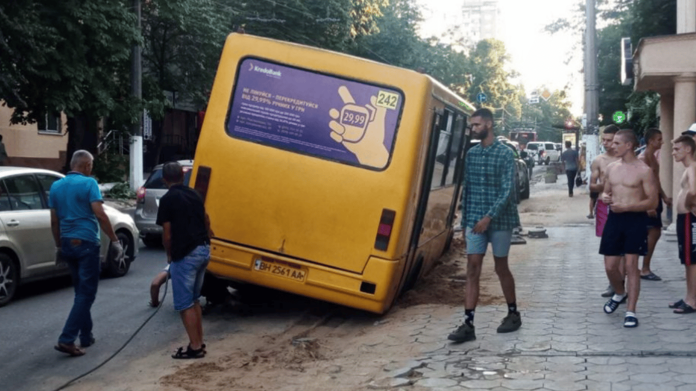 В Одессе, 14 июля, на улице Черняховского случился инцидент с маршруткой. Автобус №242 на квартале между Тенистой и Говорова провалился в траншею.