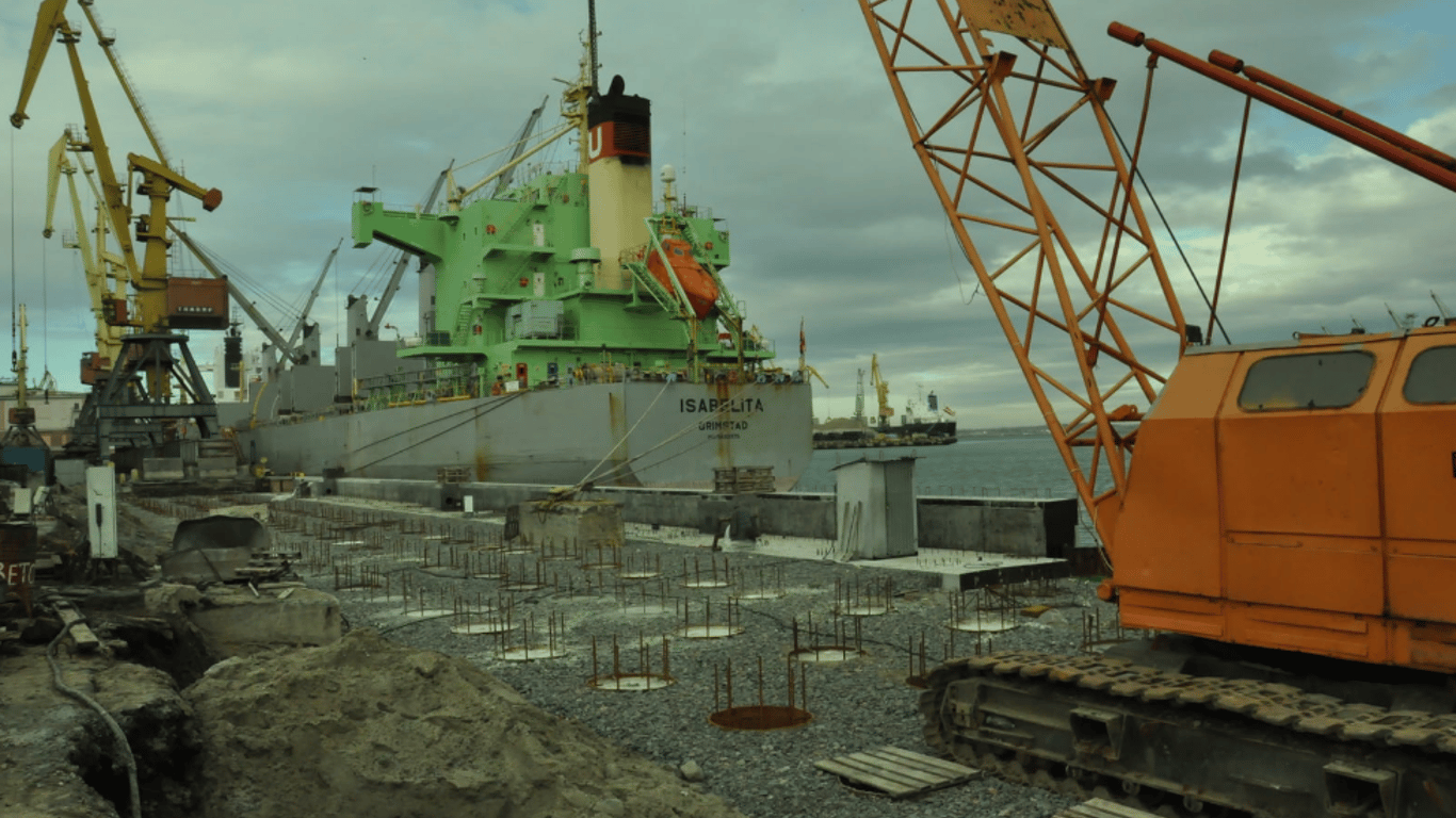 Специалисты уже завершили погружение экранирующих свай (столбов) и лицевой стенки из металлического шпунта. Еще завершили бурение грунтовых металлических конструкций, также отсыпали и уплотнили песок обратной засыпки. Рабочие также забетонировали и обустроили швартовые устройства 80-метрового участка верхнего строения причала.