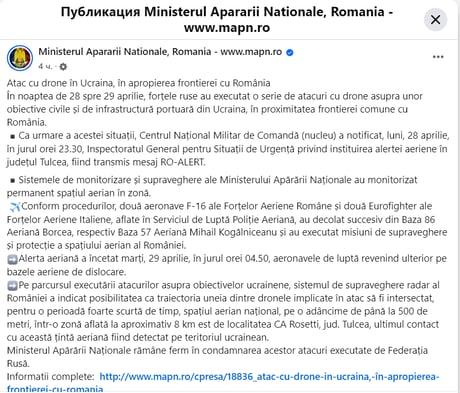В Министерстве обороны Румынии заявили, что во время новой атаки РФ на Украину в Румынии около 23:30 объявили воздушную тревогу в округе Тульча. Два самолета F-16 и два Eurofighter поднялись в воздух, чтобы выполнять задачи по наблюдению и защите воздушного пространства. Система радиолокационного наблюдения указала на то, что один из дронов на короткое время пересек национальное воздушное пространство страны.
