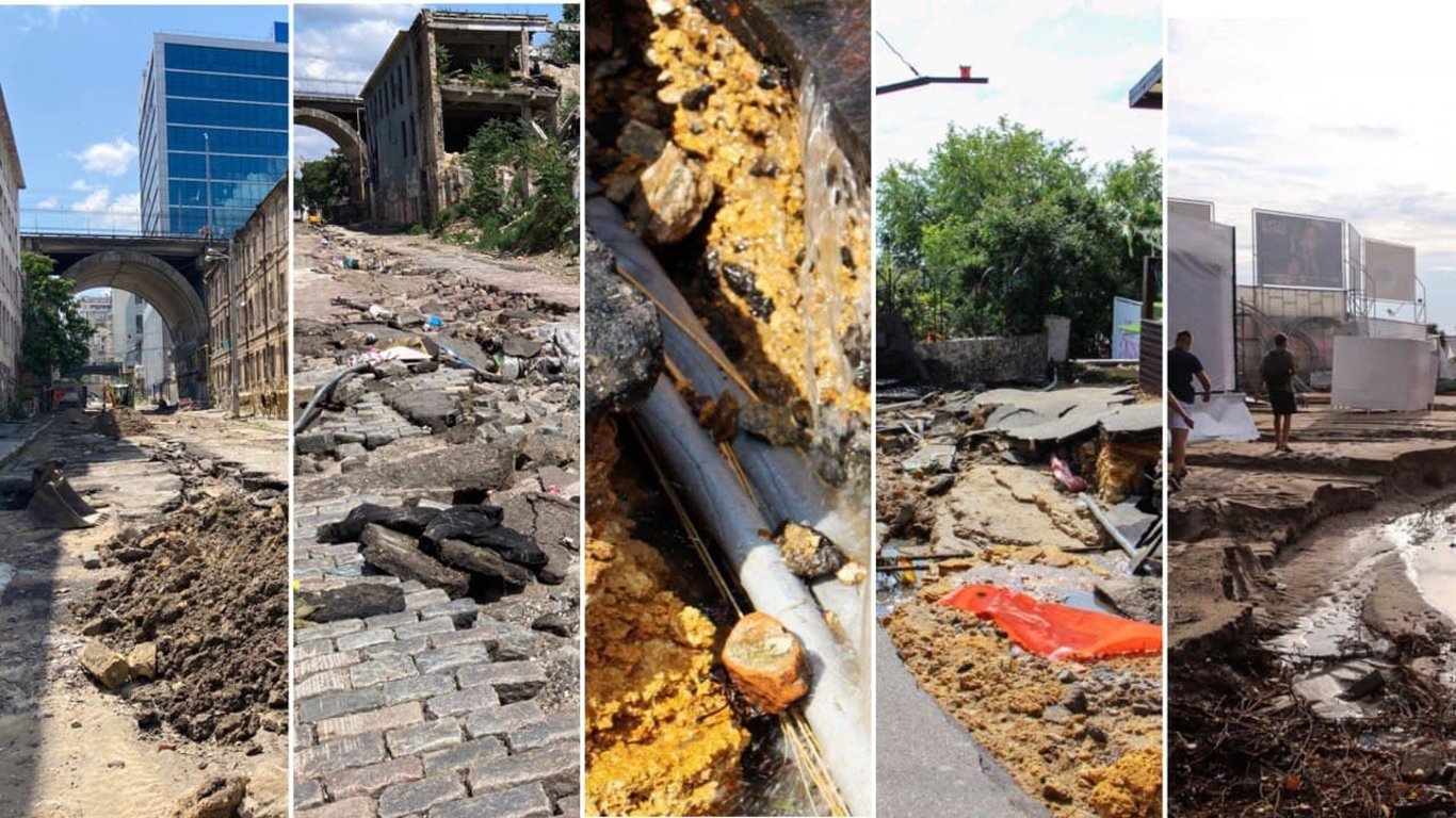 Ночной ливень не обошел стороной и многострадальный Деволановский спуск, где уже несколько месяцев перекладывают дореволюционные ливневые коллекторы диаметрами 1300 и 1800 мм.