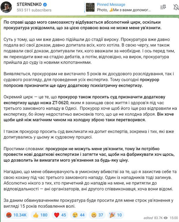 В 2018 году на Сергея Стерненко совершили три нападения, во время последнего он смертельно ранил одного из нападавших Ивана Кузнецова. Сергей утверждал — действовал в рамках законной самозащиты. В июне 2020 года Сергею Стерненко СБУ вручила подозрение, а 15 июня Шевченковский суд Киева отправил Стерненко под домашний арест, затем решение отменили, а дело передали в Приморский суд в Одессе.