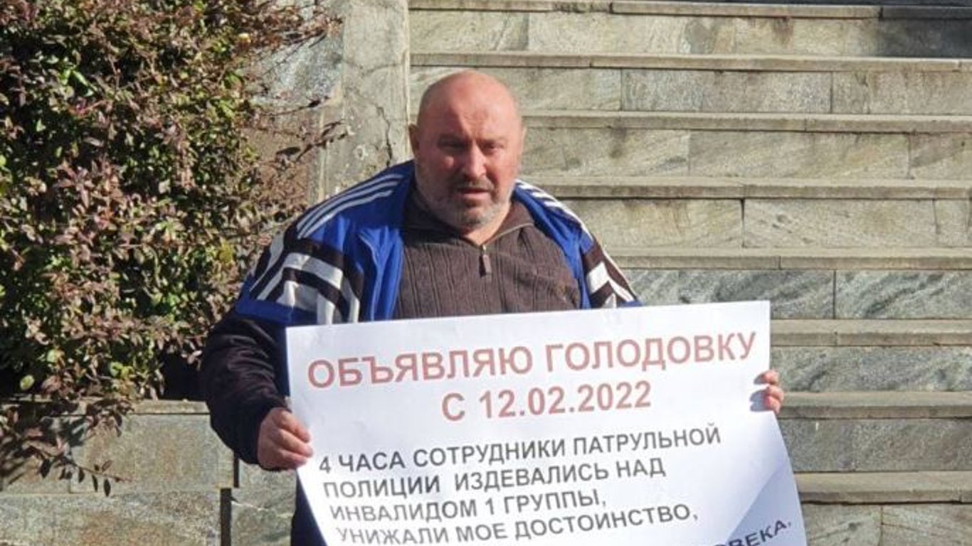 На плакате, который протестующий держит в руках, написано, что сотрудники полиции унижали его достоинство и издевались над ним на протяжении четырех часов. В связи с этим он объявил голодовку. Также мужчина уточнил, что он инвалид I группы.