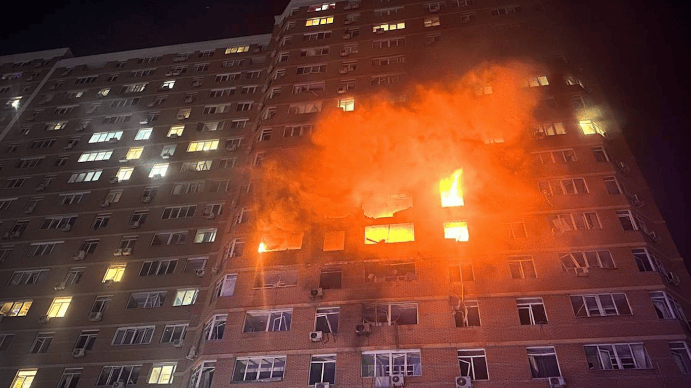 В ГСЧС информируют, что из-за попадания дрона на верхних этажах 21-этажного жилого дома произошел пожар. Огонь охватил сразу 7, 8 и 9 этажи.