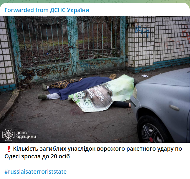 Число погибших в результате удара российских захватчиков по Одессе возросло до 20 человек. Также известно по меньшей мере о 73 пострадавших.