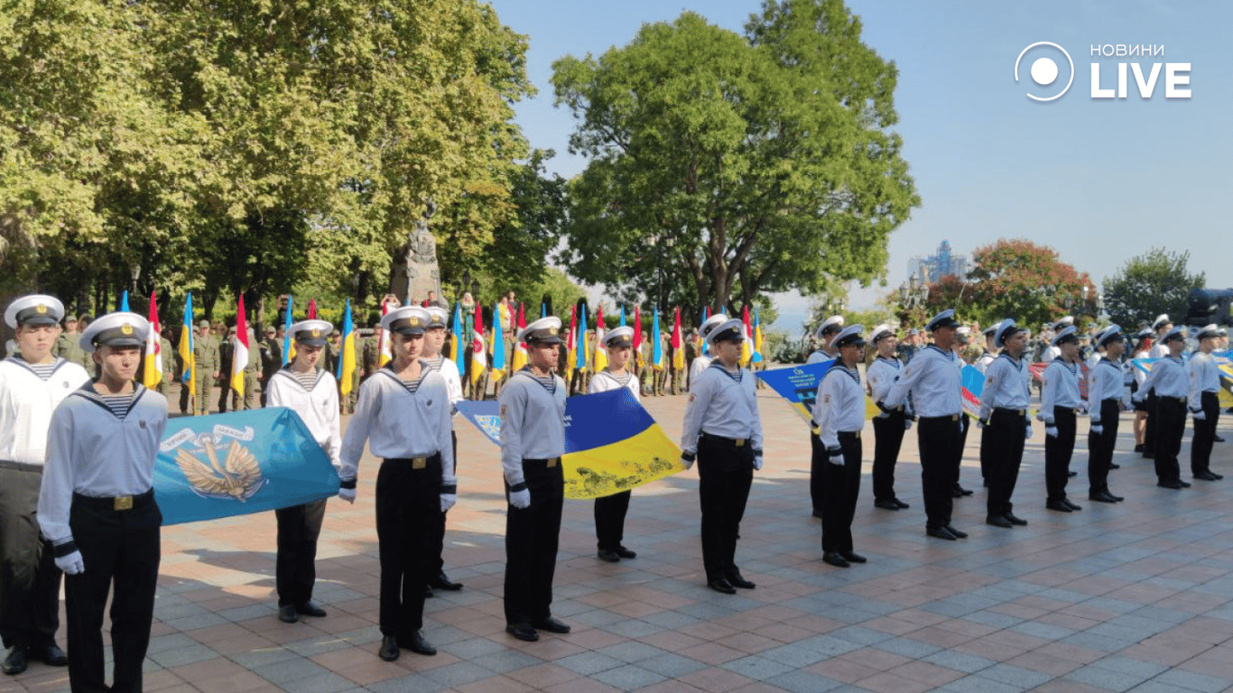 Церемония началась с исполнения гимна Украины оркестром ВМС и минуты молчания по погибшим. Среди поднятых флагов — флаг Украины и Одессы, военных подразделений, защищающих Украину, и стран-партнеров, поддерживающих борьбу с российскими захватчиками. В мероприятии приняли участие представители военных и силовых структур, руководители города и региона.