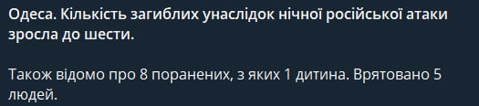 "Количество погибших в результате ночной российской атаки возросло до шести", — говорится в сообщении.