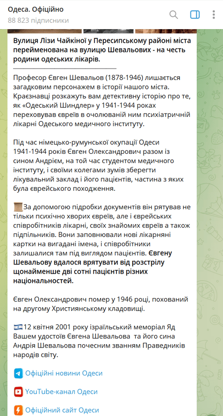 В Одессе улицу Лизы Чайкиной переименовали в честь одесской семьи врачей, которые спасли сотни жизней во время немецко-румынской оккупации. Они прятали евреев в психиатрической больнице, рискуя собственными жизнями.