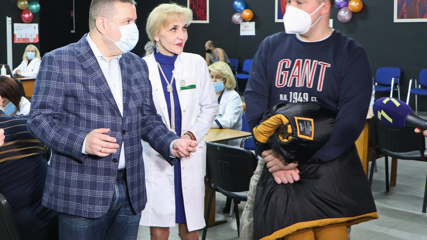 Директор департамента здравоохранения Левон Никогосян вручил подарки "юбилейном" привитом – фирменный свитшот, чашку, защитные маски, антисептики и вкусности.