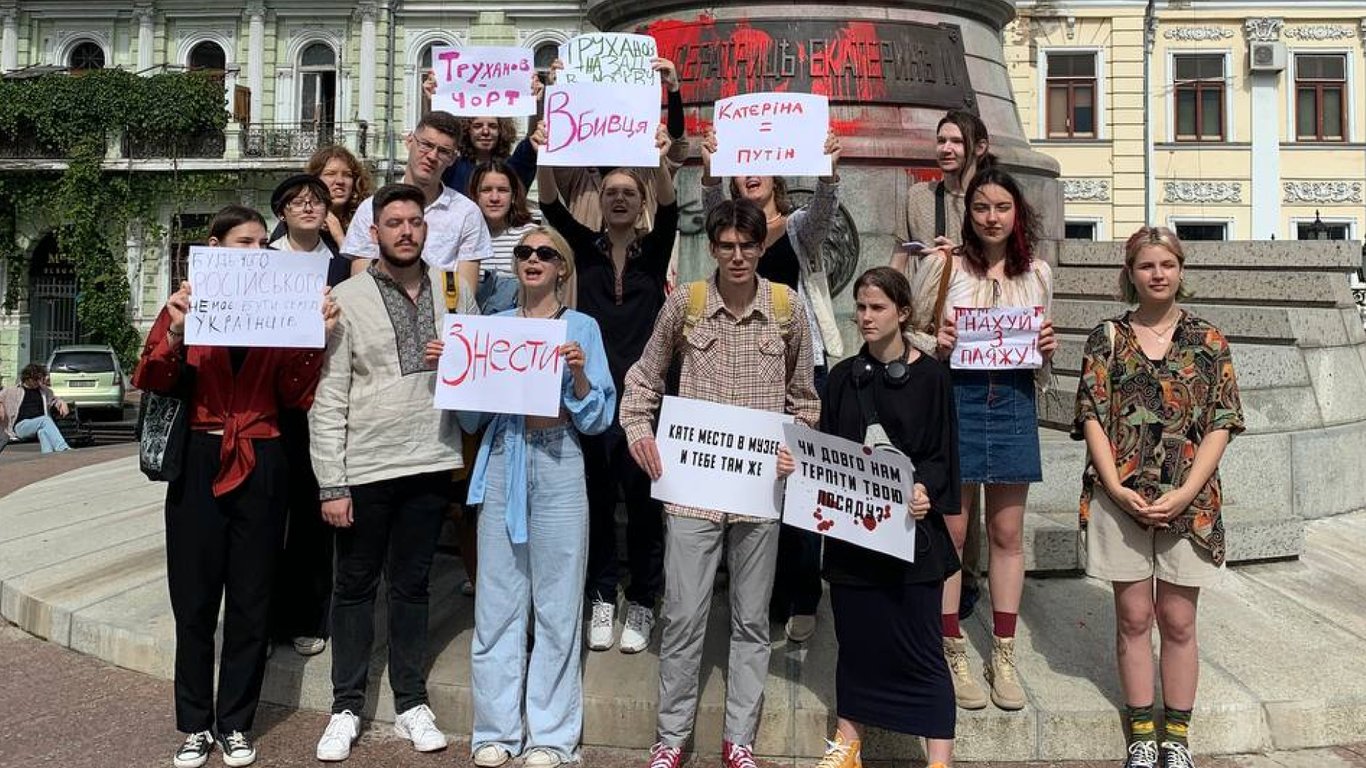 После очередной раскраски памятника Екатерине II в Одессе 18 сентября к нему вышли молодые люди на акцию протеста. С плакатами в руках активисты отказались комментировать свои действия.