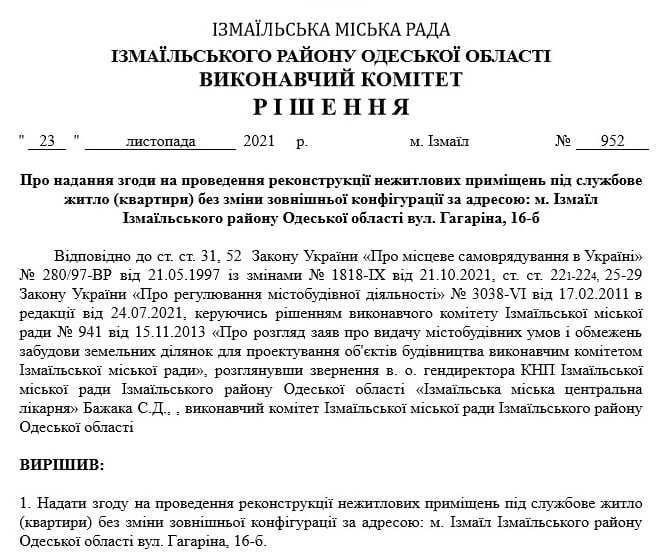 Исполком Ізїмальської городского совета согласовал работы по реконструкции нежилого помещения на квартиру для медиков. Помещение расположено на первом этаже многоквратирного дома на улице Гагарина, 16-Б. когда-то это помещение служило отделением "Ощадбанка". Общая площадь помещения составляет 71 м. кв. с соответствующим заявлением о переоборудовании помещения ранее обратился и. о. гендиректора Измаильской городской центральной больницы Сергей Бажак.