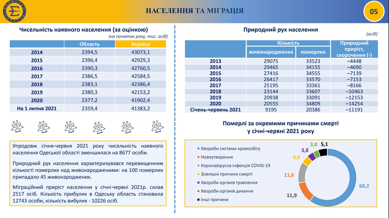 В целом ситуация с количеством населения в Одесской области ухудшается. За это время в регионе стало на 8 677 жителей меньше, а на 100 умерших приходилось лишь 45 новорожденных. Благодаря миграционному приросту, количество жителей области увеличилось на 2 517 человек.