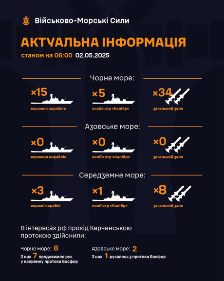 В Черном море находится 15 военных кораблей России, 5 из которых могут выпустить до 34 ракет. В Средиземное море на рейды выведены три судна РФ, одно из которых снаряжено сразу 8 "Калибрами". В Азовской акватории присутствия врага не обнаружено.