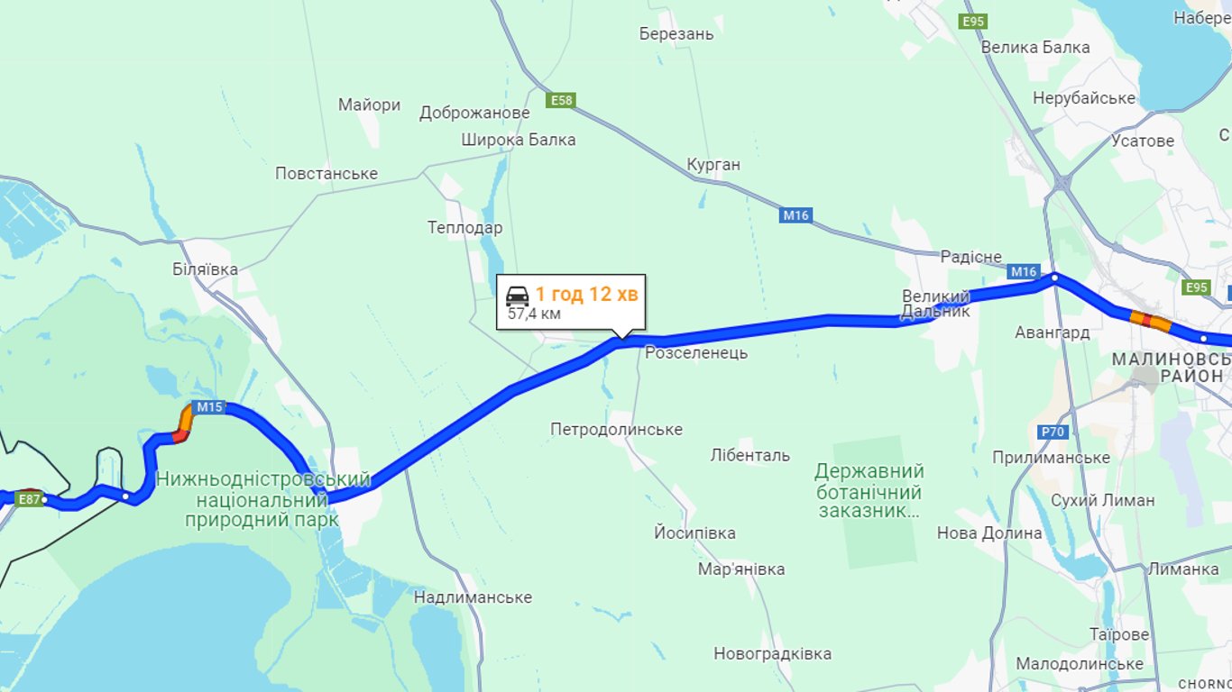 В сторону пункта пропуска "Паланка — Маяки — Удобное" есть значительные пробки в районе природного парка и молдавского КПП. Эти участки на картах обозначены красным цветом. Путешествие в Паланку продлится сегодня 1 час 12 минут.