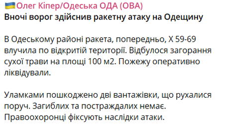 Российская ракета попала по открытой территории в Одесском районе. Загорелась сухая травка на площади 100 м2. Пожар оперативно ликвидирован.