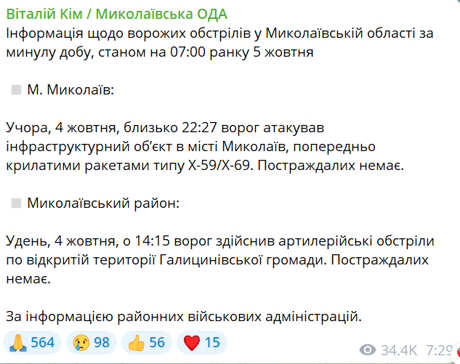 "Вчера, 4 октября, около 22:27 враг атаковал инфраструктурный объект в городе Николаев", — сообщил Ким.