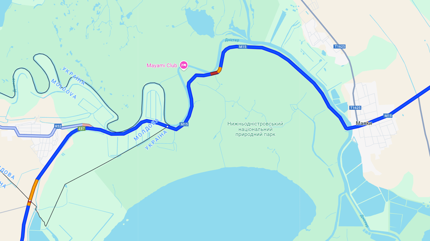 Наибольшее скопление транспорта наблюдается вблизи села Маяки и перед контрольно-пропускным пунктом на территории Нижнеднестровского национального парка. Очередь на этом участке составляет более километра, движение значительно замедлено.