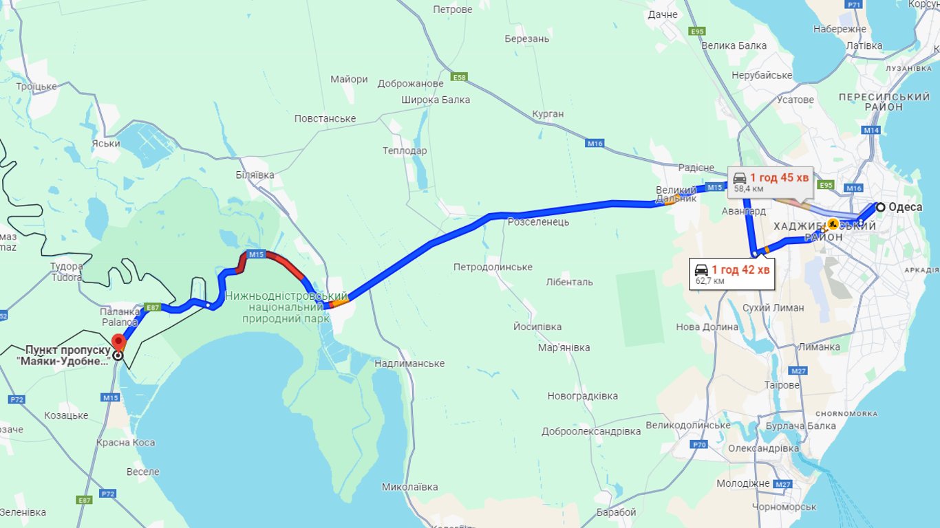 Сейчас в сторону Паланки есть большая пробка, которая начинается от Маяков и тянется вплоть до самого КПП, расположенного в пределах Нижнеднестровского национального природного парка. Там очередь достигает около 10 километров, и движение сильно усложнено. Этот участок на картах обозначен красным цветом. Перед самым пунктом также есть очереди на пересечение границы.