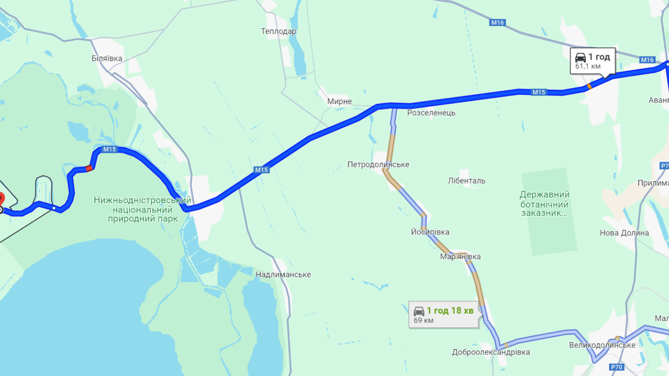 Сейчас в сторону пункта пропуска "Паланка — Маяки — Удобное" есть пробка в районе Маяк и КПП. Эти участки на картах обозначены оранжевым цветом. Путешествие в Паланку продлится сегодня более часа. На самом автомобильном пункте пропуска очередей тоже не наблюдается.