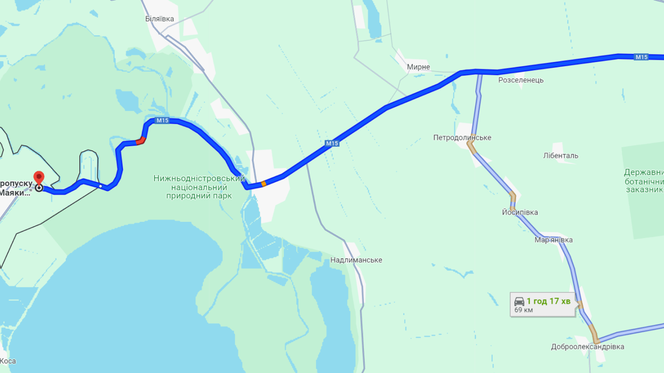 В сторону пункта пропуска "Паланка — Маяки — Удобное" есть пробки в районе Маяк и КПП. Эти участки на картах обозначены красным цветом. Путешествие в Паланку продлится сегодня более часа. На самом автомобильном пункте пропуска очереди не наблюдаются