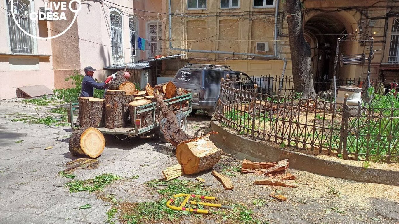 Утром, 26 мая, в одном из одесских дворов упало дерево. Местные жители, которые были во дворе, успели отогнать автомобили, поэтому старая черешня задела только балкон и перекрыла проезд.