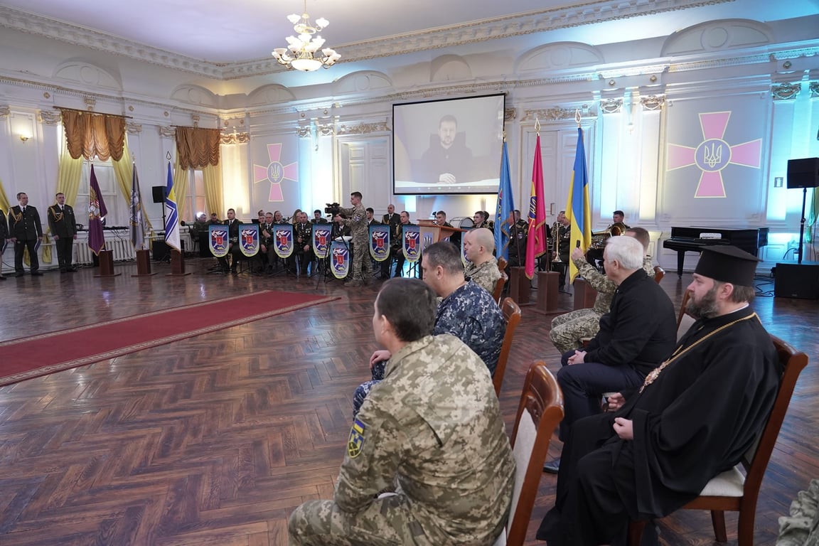 "Господа офицеры! Уже скоро вы отправляетесь в действующую армию, в наши Силы обороны. Вы пополните коллективы боевых бригад — механизированных и мотопехотных, танковых и артиллерийских, десантно-штурмовых и горно-штурмовых, штурмовых и морских пехоты. Некоторые из вас возглавит подразделения в новых штурмовых бригадах, которые только формируются. Победа Украины — будет!" — сказал Владимир Зеленский.
