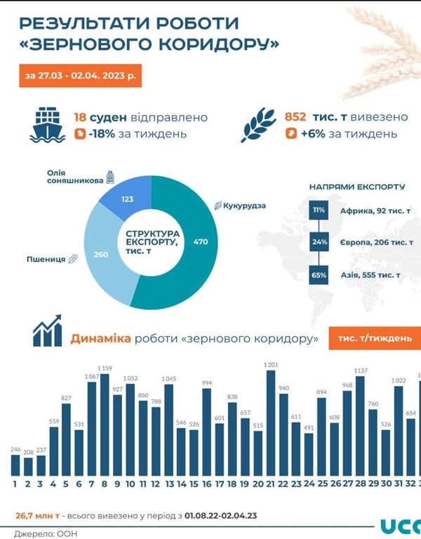 Следует упомянуть, что 18 марта было принято решение о пролонгации работы "зернового коридора" на 120 дней. С начала его работы с 1 августа 2022 по 2 апреля 2023 удалось экспортировать почти 27 млн тонн агропродукции нашим иностранным партнерам.