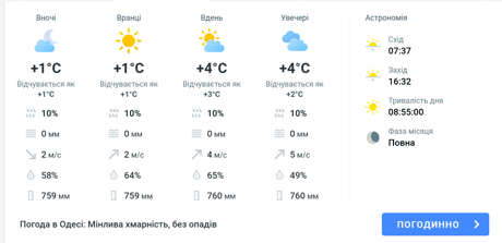 День: вдень в Одесі зберігатиметься мінлива хмарність. Температура становитиме близько +4 °C. Вітер західний 2 м/с.