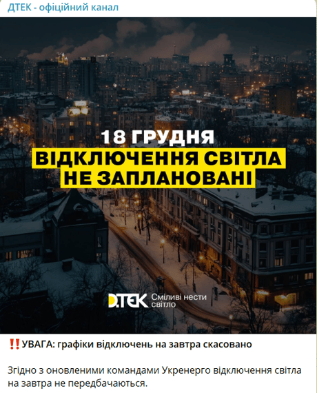 Сьогодні, 18 грудня, в Одесі скасовані графіки відключення світла. Однак, ситуація може змінитися протягом доби. Це залежить від стану енергосистеми. Про повернення графіків енергетики обіцяють попередити заздалегідь.