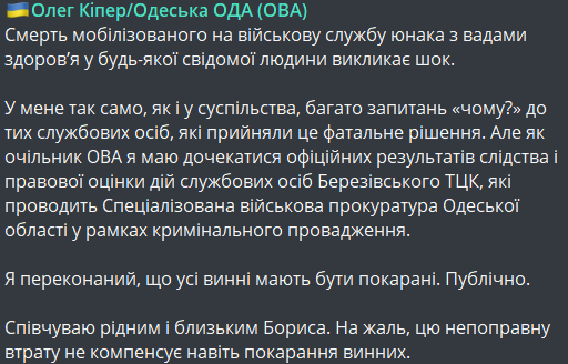"Як очільник ОВА, я маю дочекатися офіційних результатів слідства і правової оцінки дій службових осіб Березівського ТЦК, які проводить Спеціалізована військова прокуратура Одеської області у рамках кримінального провадження. Я переконаний, що усі винні мають бути покарані. Публічно", — наголосив Кіпер.