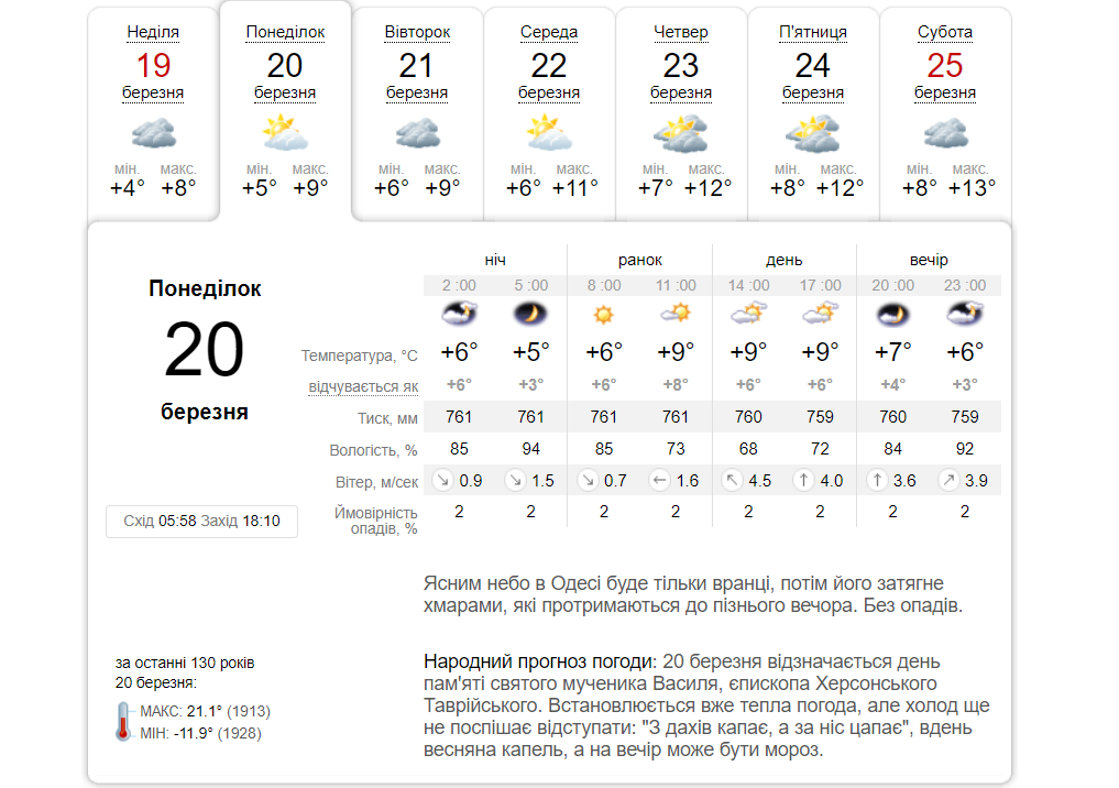 Протягом дня температура мінлива хмарність, без опадів. Пориви вітру сягатимуть до 10 м/с.