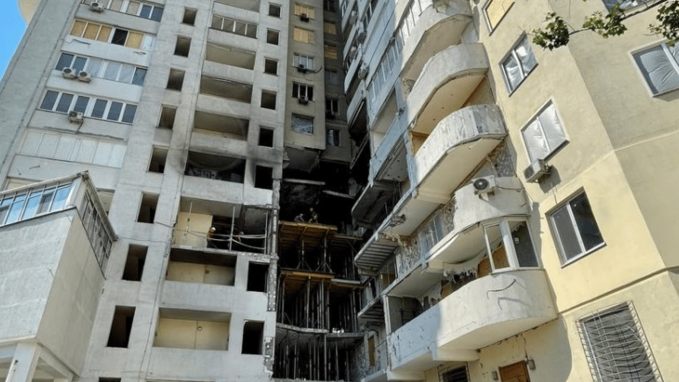 Шістнадцятиповерхову споруду пробило наскрізь. Внаслідок влучання ракети було пошкоджено дві секції ЖК, зруйновано понад 400 кв.м опорних конструкцій на чотирьох поверхах, 30 квартир знищено повністю, ще 62 отримали руйнування різного ступеня.