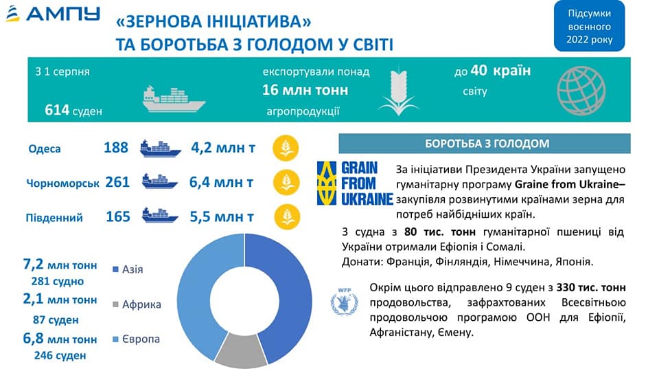 Всупереч обстрілам транспортної та критичної інфраструктури, всупереч перепонам, які створювали представники країни-агресора — за підсумками 2022 року 614 суден експортували понад 16 мільйонів тонн агропродукції. Агропродукцію експортували до 40 країн світу.