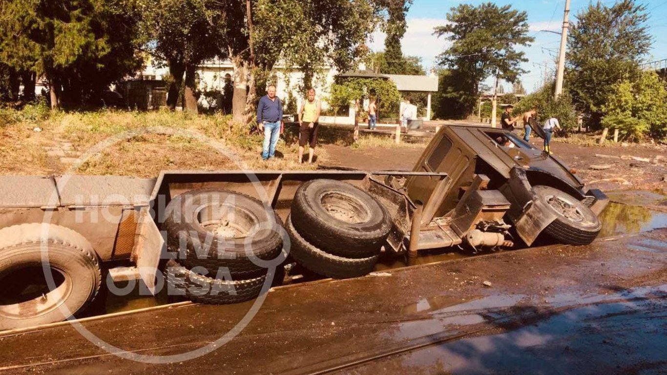 В Одесі на Пересипі через негоду, яка накрила Одесу вночі 22 липня, перекинувся та частково затонув КамАЗ. Вочевидь водій не впорався із керуванням через сильну зливу.