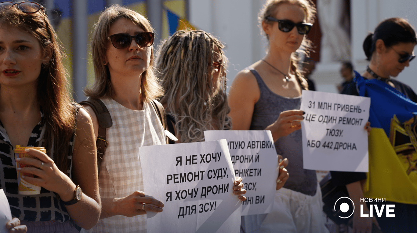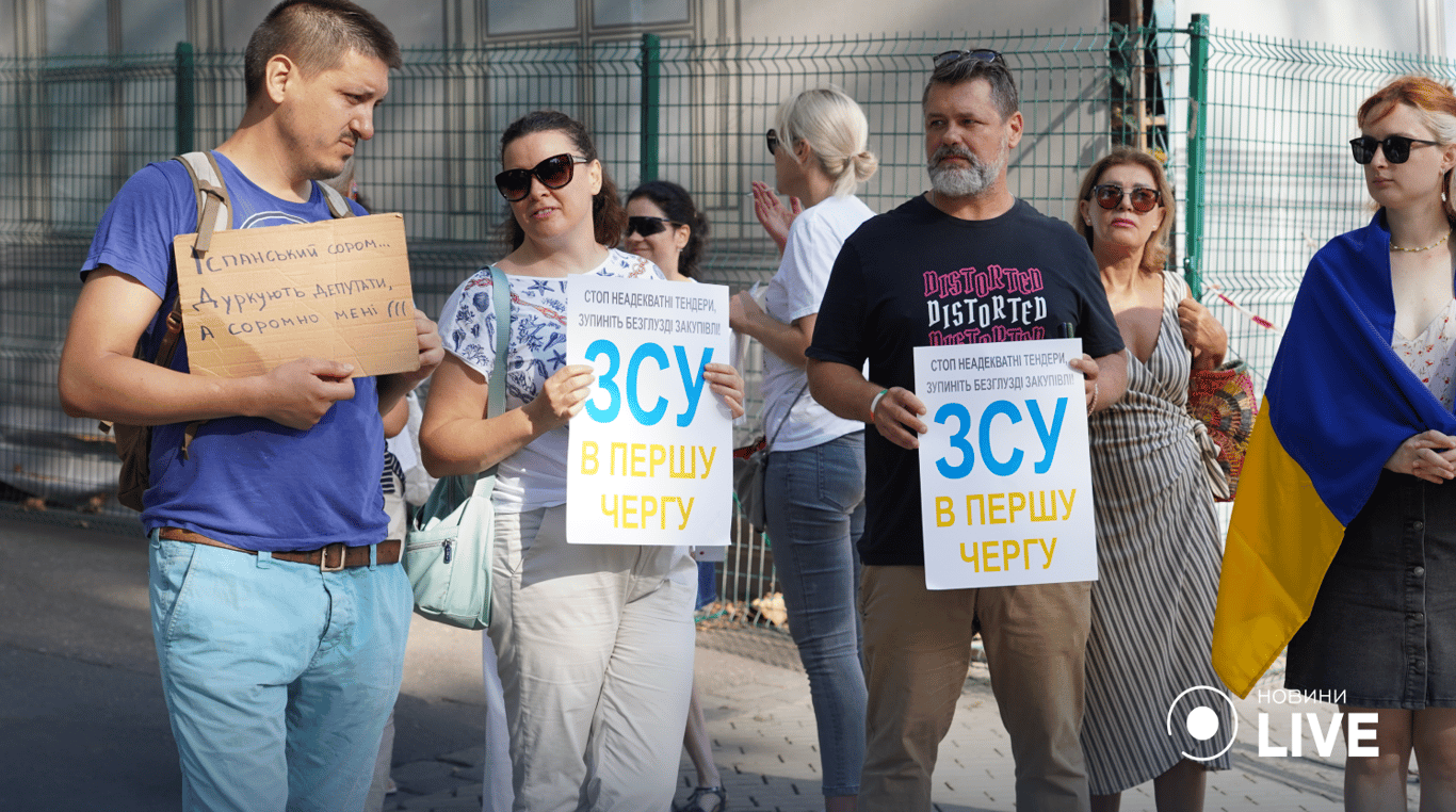 Сьогодні під стіни Одеської мерії знову прийшли волонтери та мешканці міста. З плакатами в руках люди вимагали припинити витрати з бюджету на ті статті видатків, які не є критичними у період воєнного стану.