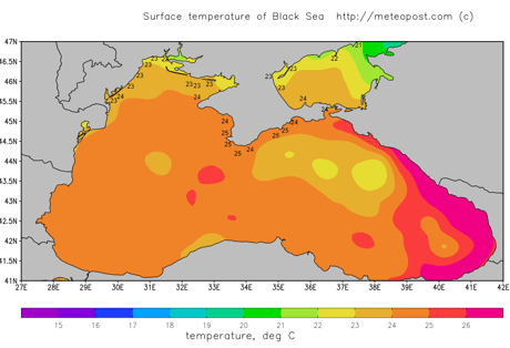 Максимальна наразі температура Чорного моря в територіальних водах України фіксується біля тимчасово окупованого Криму. Вода біля Судака, Коктебелю та Фороса прогрілася до +25°С. В Одесі, біля Затоки, Чорноморська, Кароліно-Бугаза температура води сягає +23°С.
