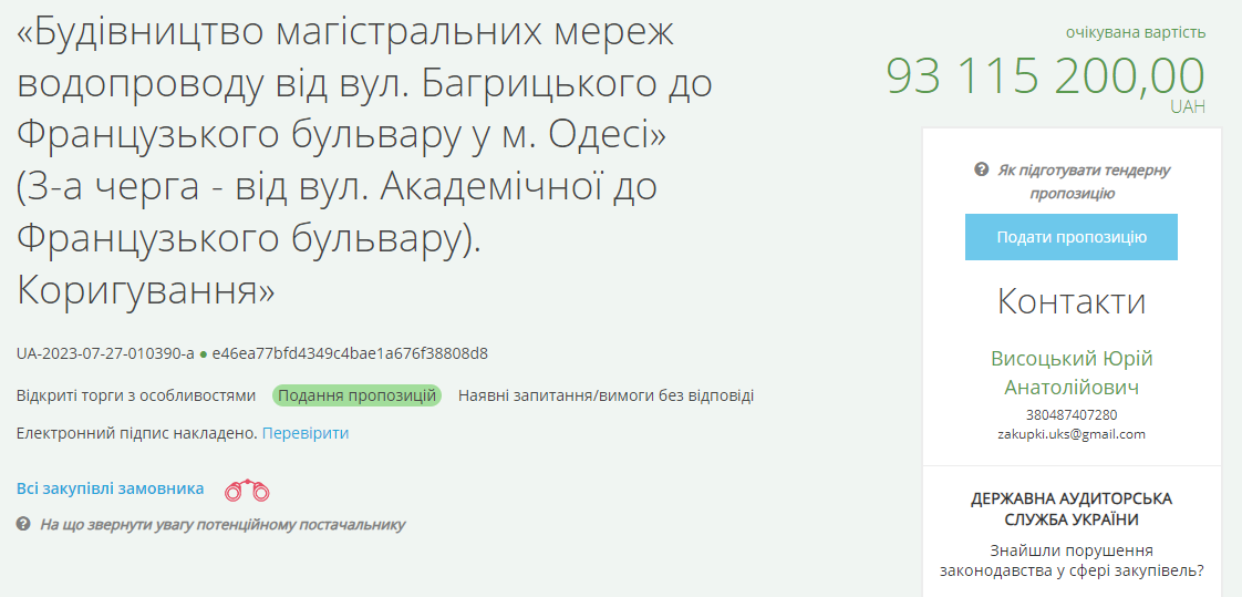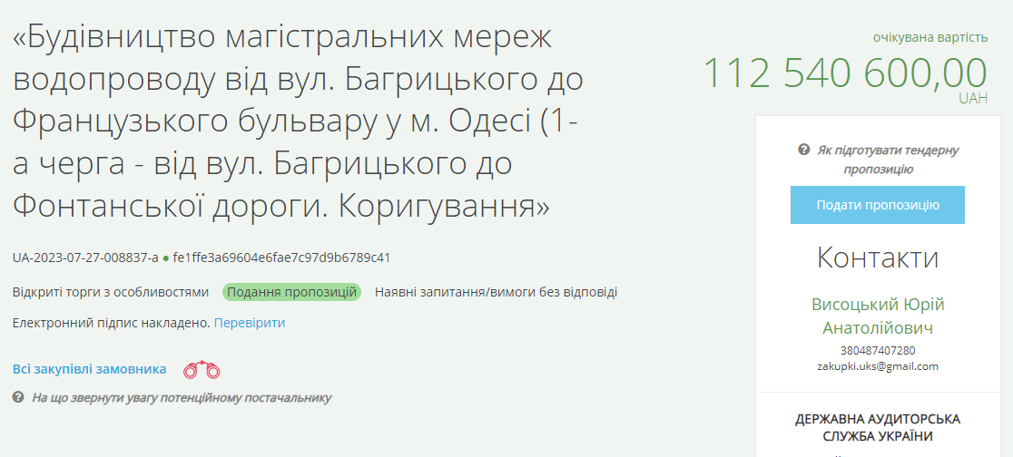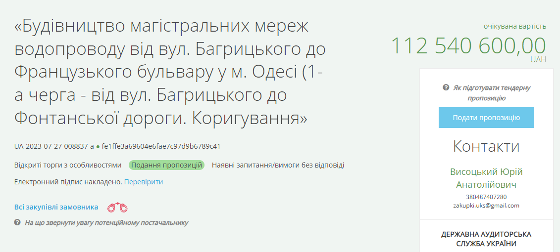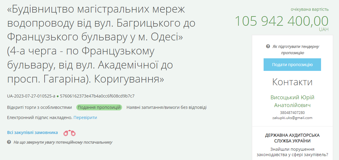 На порталі прозорих закупівель знаходиться одразу чотири тендери, які загалом складатимуть водопровід від вулиці Багрицького до Французького бульвару.